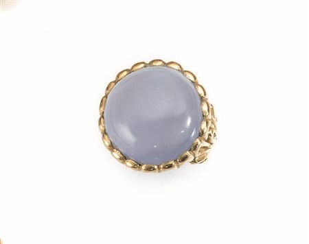Anello in oro giallo e calcedoniodecorato da un grande calcedonio circolare...