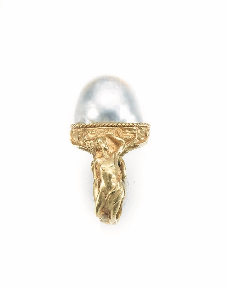 montatura sbalzata e cesellata a figure mitologiche, al centro della quale è montata una perla barocca entro castone ovale profilato da cordonetto, g 23