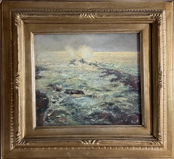 Firma indecifrata, " Mareggiata" olio su cartone telato (cm 28,5x32), in cornice