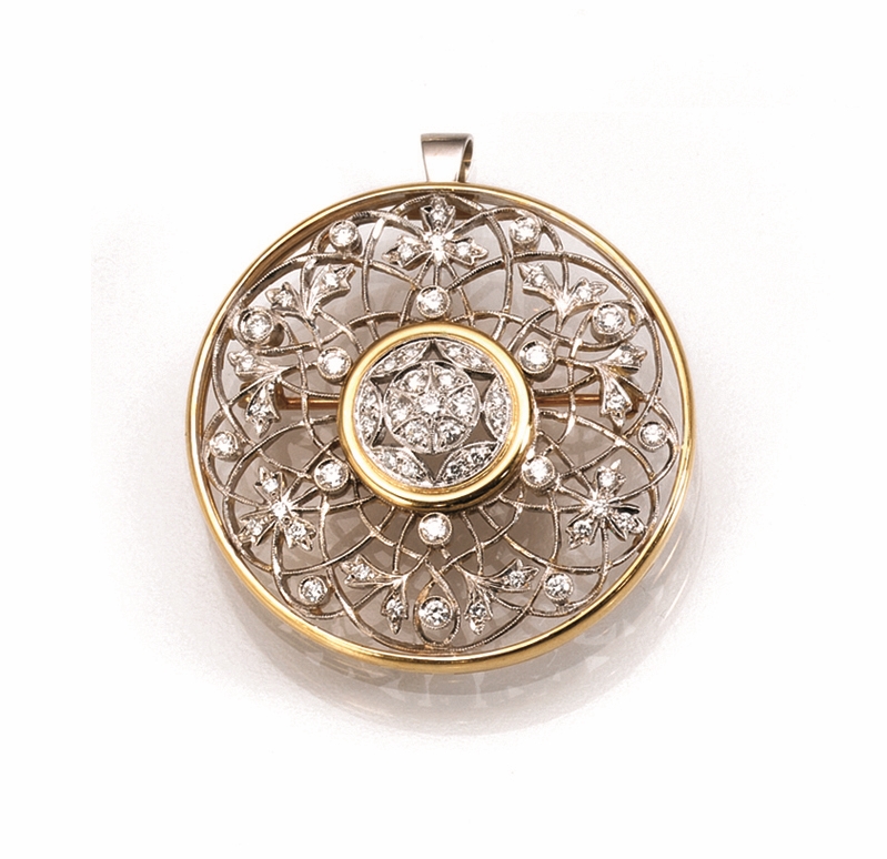 Spilla-pendente in oro bianco, oro giallo e diamanti