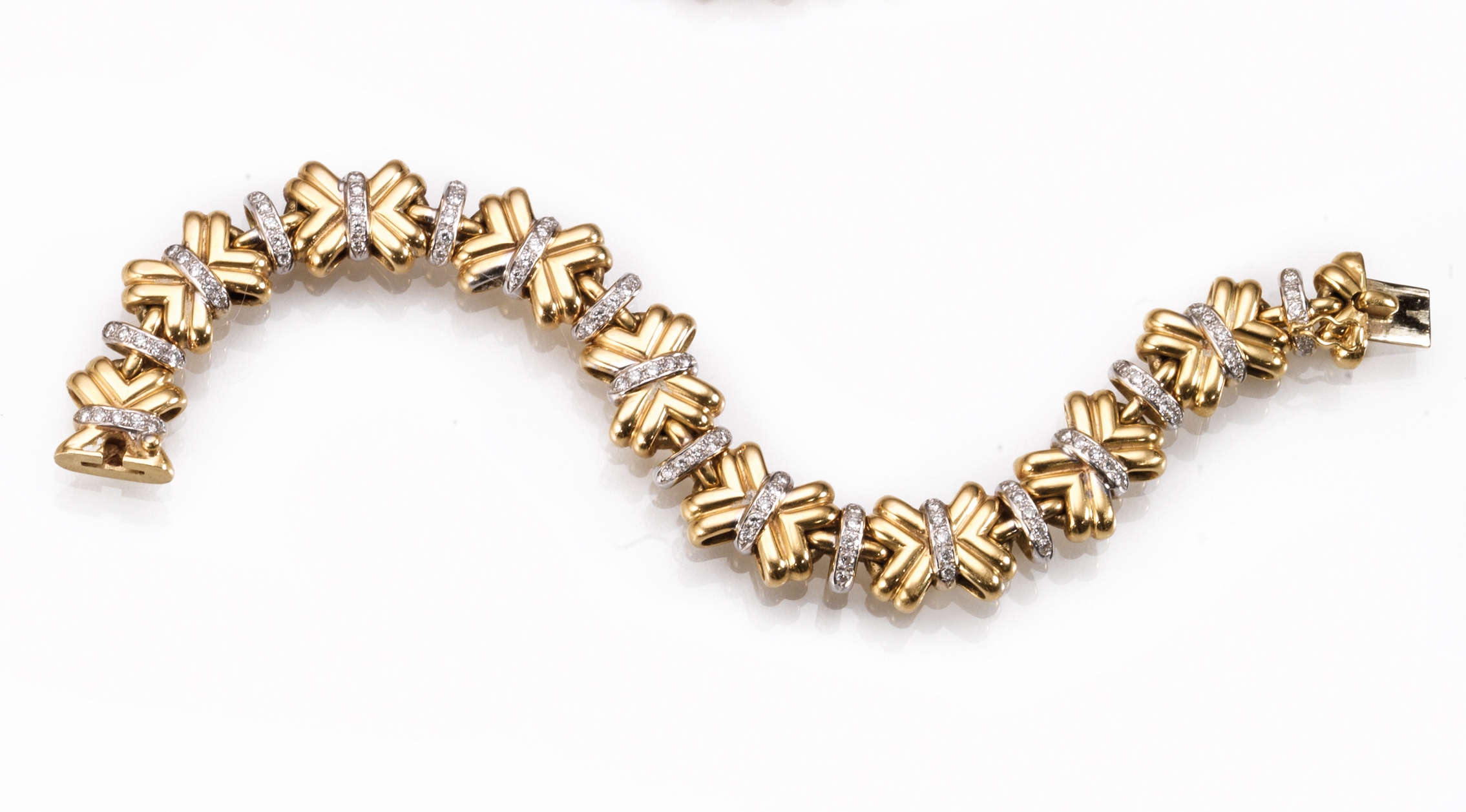 realizzato ad una fila di maglie bombate ad x intercalate da barrette decorate in brillanti, g 55, en suite con la collana