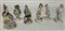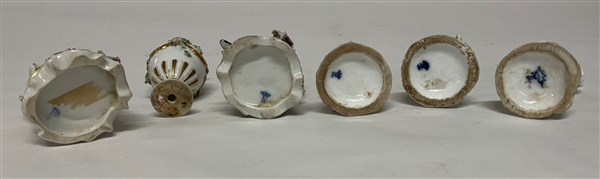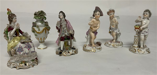 Manifatture differenti, lotto composto da due sculturine in porcellana policroma con figure in abiti settecenteschi, tre figurine raffiguranti putti alati e un elemento decorativo a vaso con fiori (h max cm 12,5) (difetti e mancanze)
