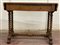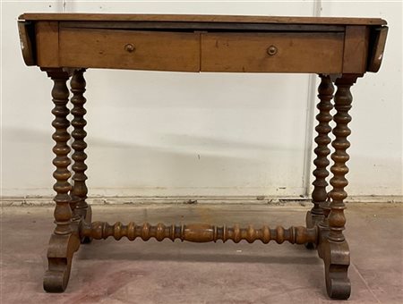 Tavolo ad alette a due cassetti nella fascia. Gambe riunite da traversa, montanti torniti poggianti su piedi sagomati. Secolo XIX (cm 113x57x77) (difetti)