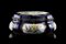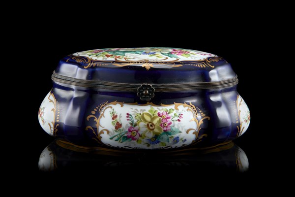 Manifattura francese, secolo XIX. Scatola in porcellana decorata su fondo blu a