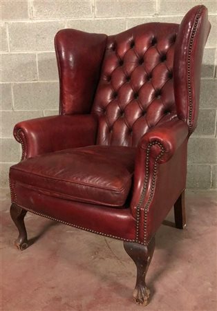 Poltrona a orecchioni rivestite in pelle bordeaux borchiata con gambe in legno (difetti)
