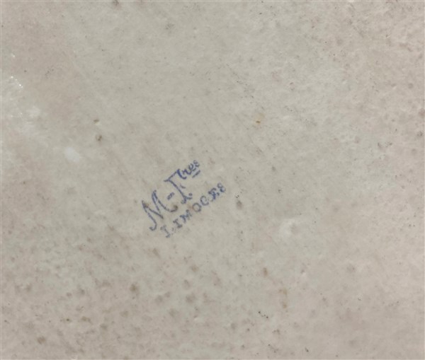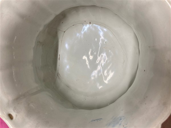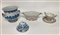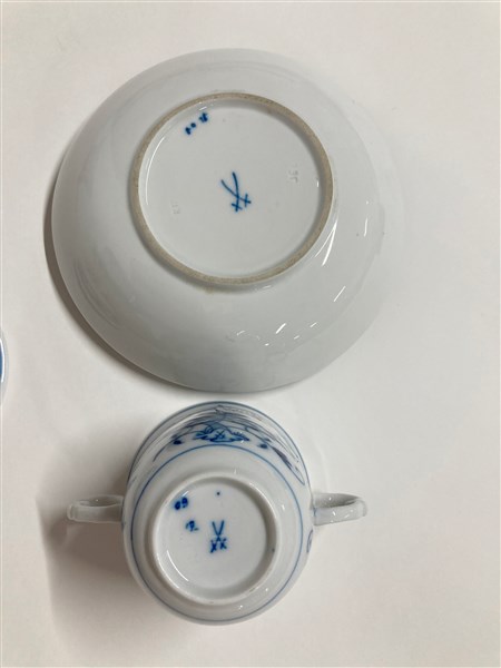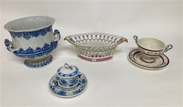 Manifatture diverse, lotto composto da una tazza da brodo con piattino a decoro monocromo blu marcata Meissen, un centrotavola con bordo traforato, una tazza biansata con piattino (difetti e restauri)