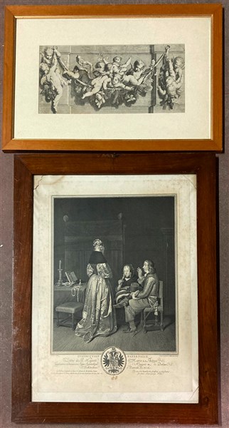 Due incisioni raffiguranti giochi di cherubini e scena d'interno, misure divers