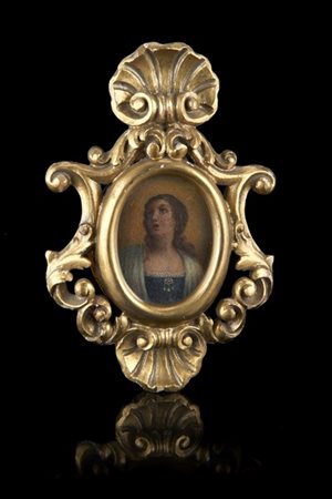 Ignoto secolo XVIII. Ritratto di dama con scialle bianco. Miniatura ovale (cm 6x4,5) in cornice dorata e intagliata a valve di conchiglia.