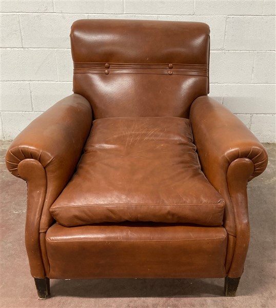 Poltrona rivestita in pelle marrone, gambe posteriori sagomate (difetti)