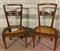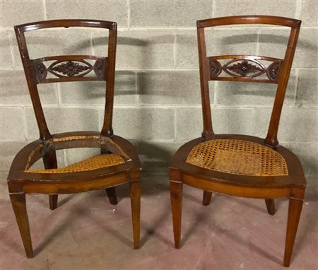 Coppia di sedie in legno, schienale a giorno ricurvo, cartella intagliata a motivi floreali, gambe anteriori rastremate e posteriori a sciabola. Seduta in cannettè. Secolo XIX (difetti)