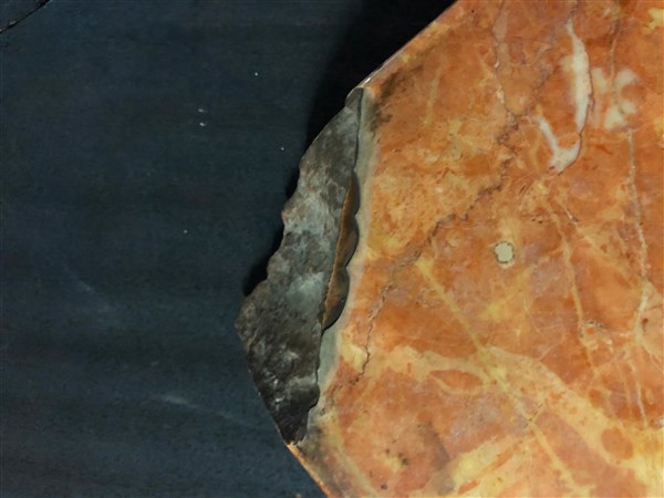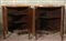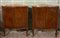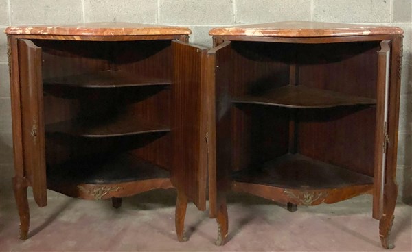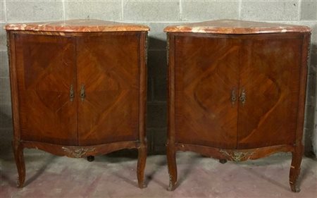 Coppia di angoliere a due ante in legno lastronate e filettate, fronte mosso decorato con applicazioni in metallo dorato, piedi anteriori sagomati. Piani in marmo (cm 82x102x49) (difetti, rotture e mancanze)