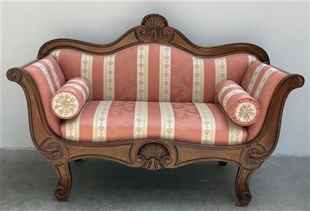 Divano a barca di forma sagomata con schienale e fascia intagliata a volute e valve di conchiglia. Braccioli e gambe terminanti a ricciolo. Rivestito in tessuto operato (l cm 149