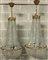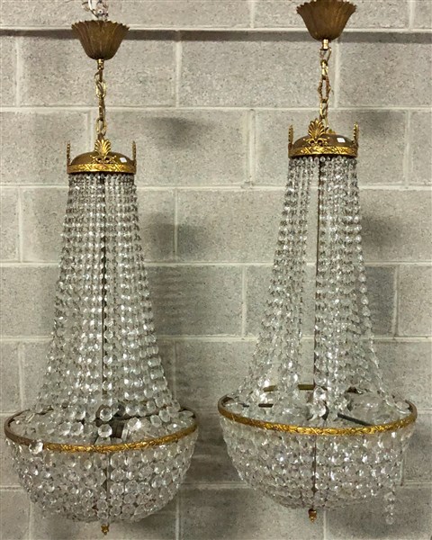 Coppia di lampadari a cesto a tre luci in metallo dorato decorato in rilievo a palmette e catenelle di rosette in vetro (h cm 110) (difetti)