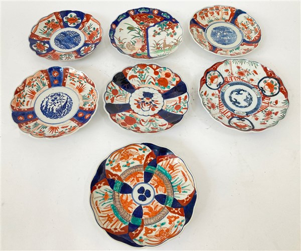 Lotto di sette piatti con bordi polilobati decorati in policromia a vasi fiorit