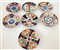 Lotto di sette piatti con bordi polilobati decorati in policromia a vasi fioriti motivi vegetali e animali