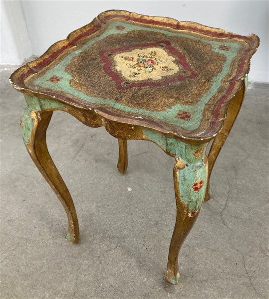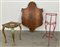 Lotto composto da uno sgabello in legno intagliato e laccato, un espositore sag
