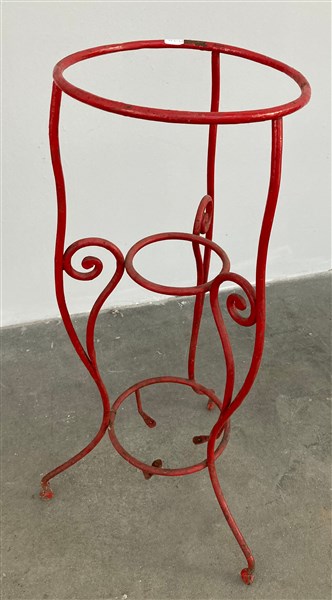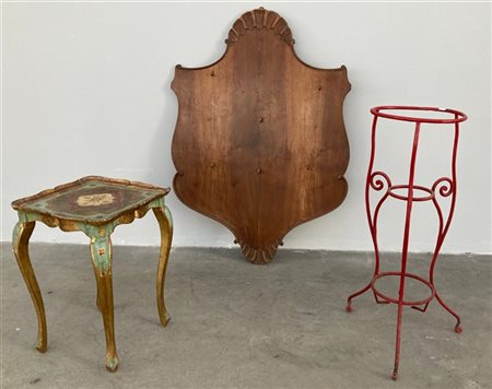 Lotto composto da uno sgabello in legno intagliato e laccato, un espositore sagomato e un portavaso in ferro battuto dipinto (difetti e mancanze)