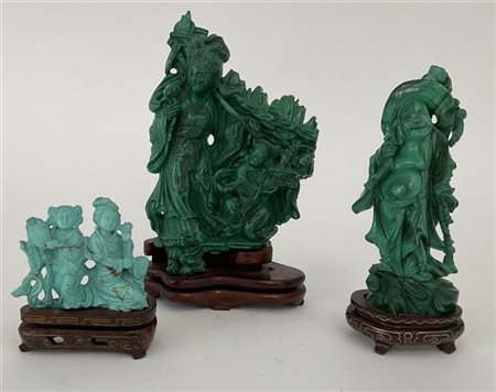 Lotto composto da due gruppi in malachite ed uno in pasta di turchese raffigura