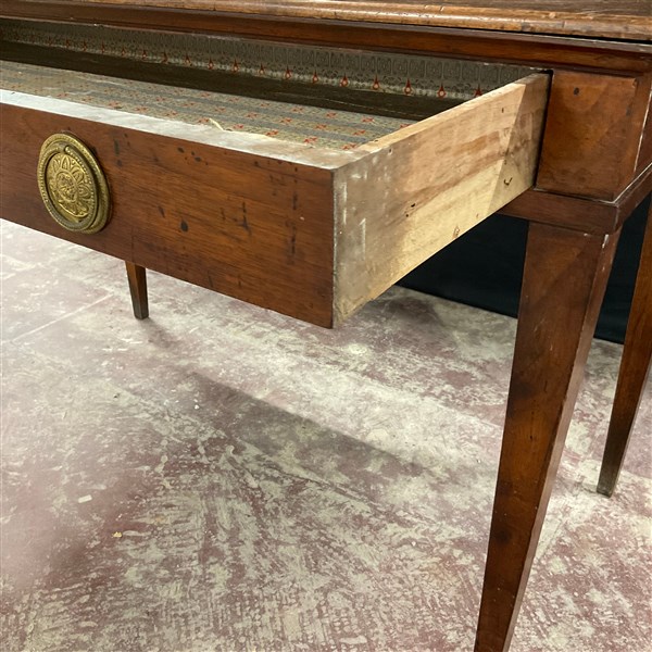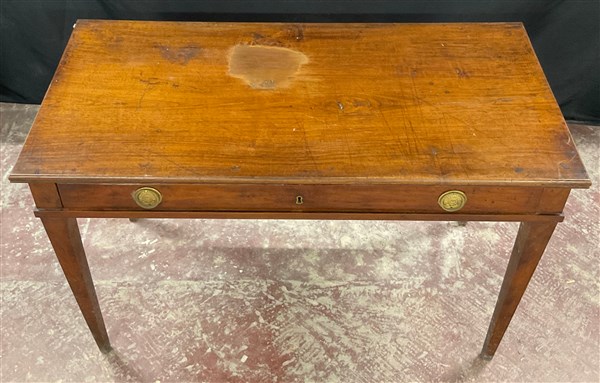 Tavolo scrittoio in legno con cassetto sottopiano, quattro gambe rastremate, guarnizioni in metallo dorato, inizio secolo XIX (cm 120x76x59) (difetti)