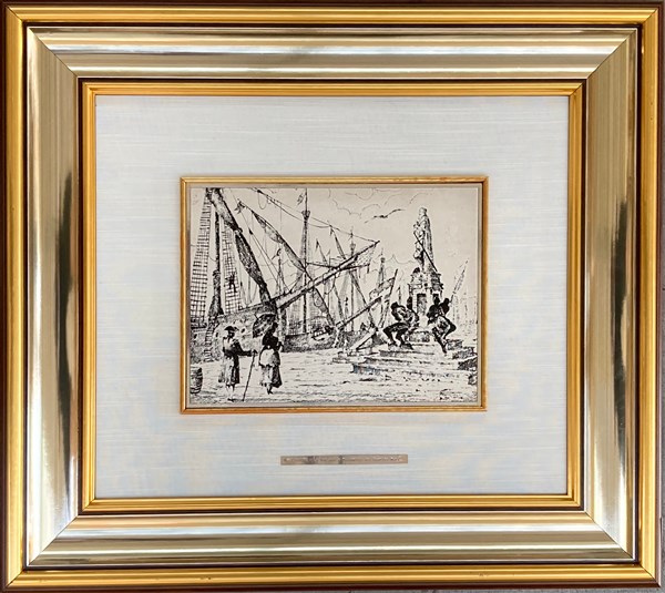 Francioli, Livorno - La Darsena e Monumento dei Quattro Mori, serigrafia su lamina d'argento (cm 20x15) in cornice (lievi difetti)