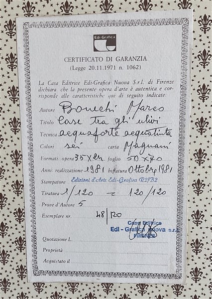 "Case tra gli ulivi" acquaforte e acquatinta (lastra cm 25x35, foglio cm 50x70) es. 18/120, firmato e numerato in basso