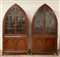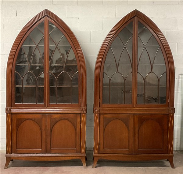Coppia di librerie a due corpi in mogano con montanti intarsiati in legno chiaro e fasce scanalate. Parte inferiore a due sportelli pannellati, parte superiore a due ante vetrate di forma ogivale decorate con sagomette in rilievo. Inghilterra, secolo XIX (cm 117,5x230x38,5) (lievi difetti)