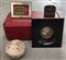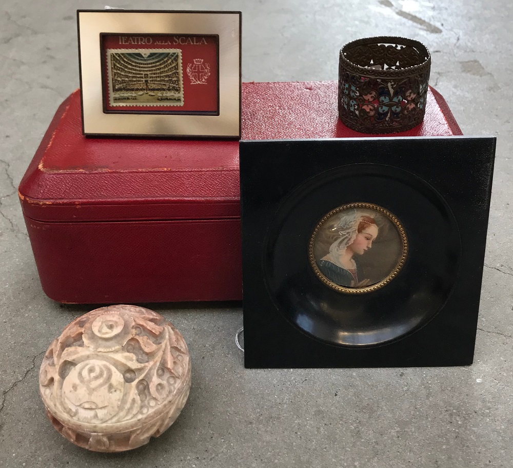 Lotto composto da una miniatura, una piccola cornice in argento, una scatola, un portatovaglioli con smalti, una scatolina tonda in pietra dura e una foglia in vetro acidato (difetti)