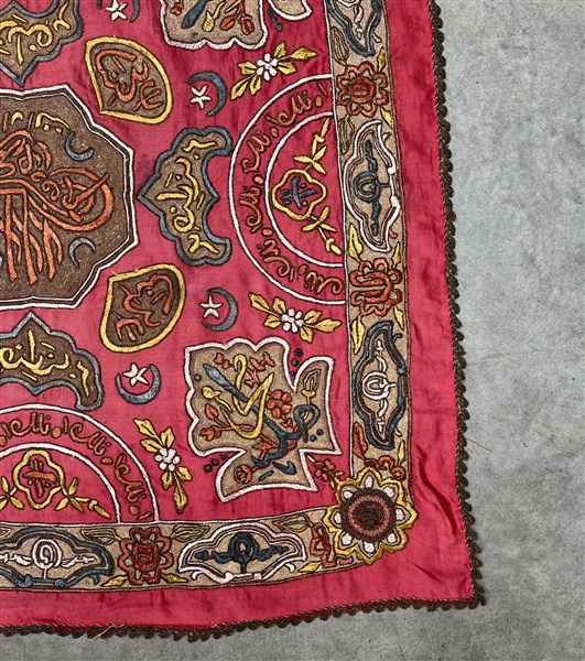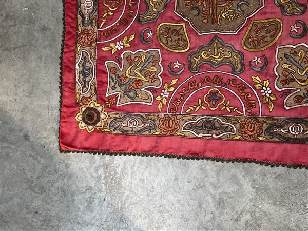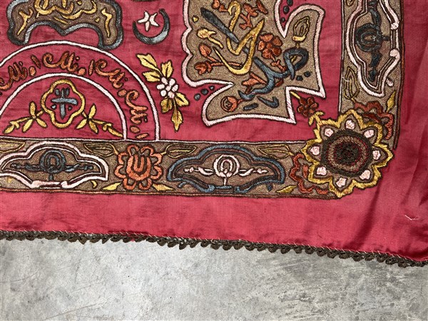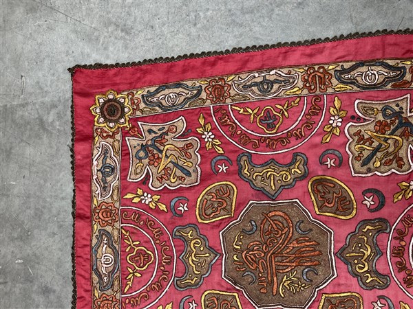 Ricamo in fili metallici su taffetà di seta rosso, recante Turgà (sigillo) del Sultano. Impero Ottomano, secolo XIX (cm 90 x 90) (difetti e rotture)