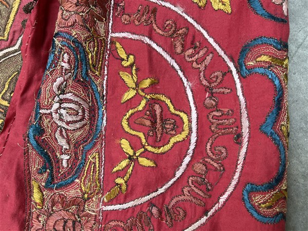 Ricamo in fili metallici su taffetà di seta rosso, recante Turgà (sigillo) del