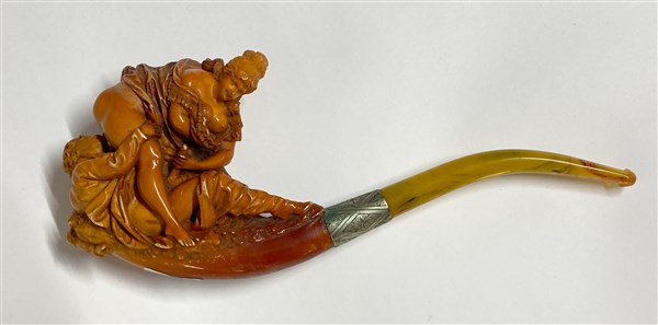 Pipa in schiuma di mare scolpita a scena erotica, ghiera in metallo inciso a motivi geometrici, bocchino in metacrilato. Secolo XIX (cm 22x9) In custodia