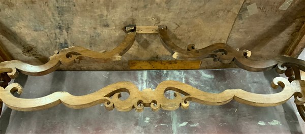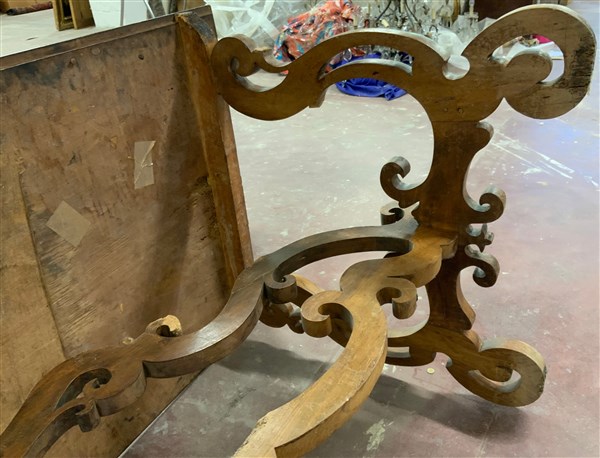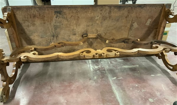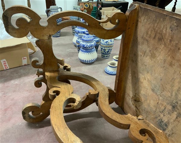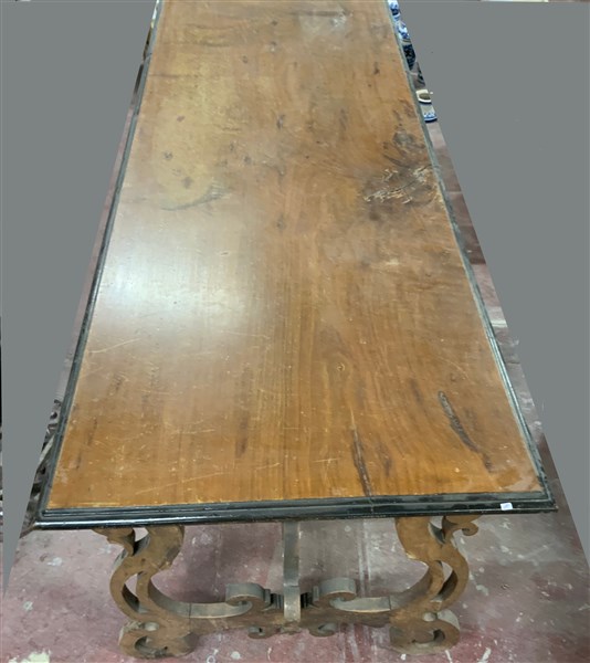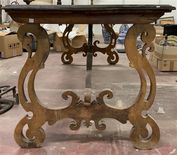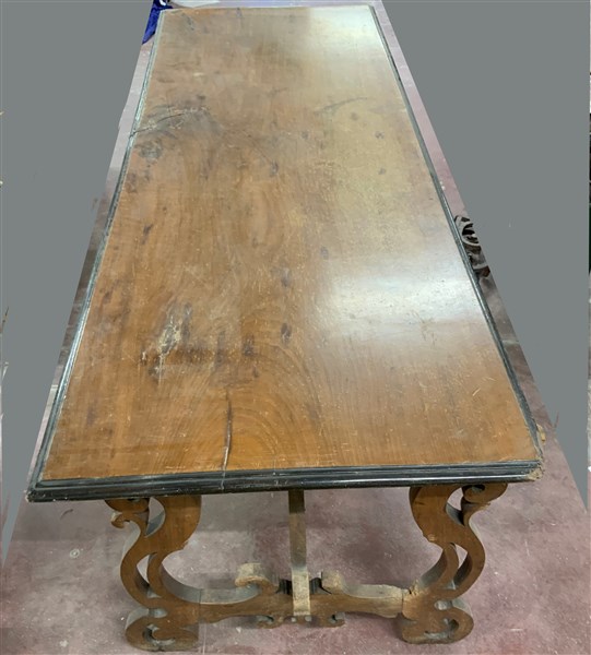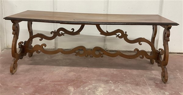 Lotto 2684 | Tavolo fratino in legno intagliato con gambe a lira riunite da traversa (cm 218
