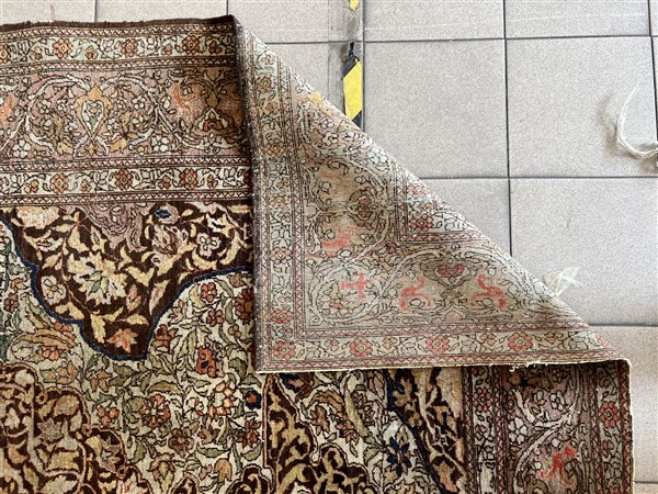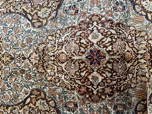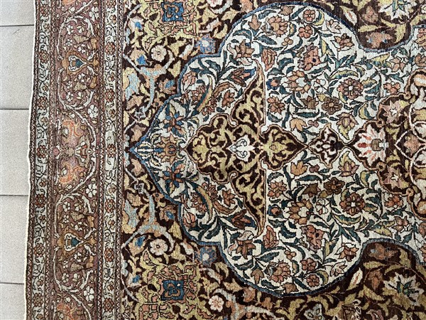 Tappeto Tabriz, Persia, prima metà del secolo XX. Decoro con grande medaglione a fondo tabacco decorato con fiori e volute, con due grandi puntali. Campo a fondo bianco cosparso di rami fioriti. Bordura a meandro su campo color lilla (cm 218x138) (gravi difetti)