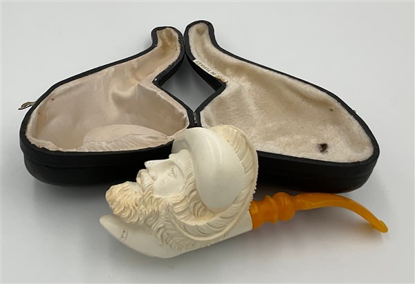 Pipa in schiuma di mare intagliata con profilo di uomo barbuto con cappello, bocchino in metacrilato giallo. Turchia, secolo XX. In custodia (L. cm 17) (lievi difetti)
