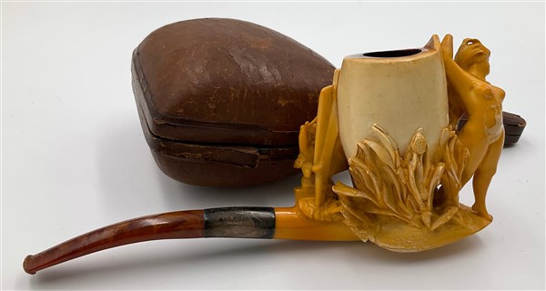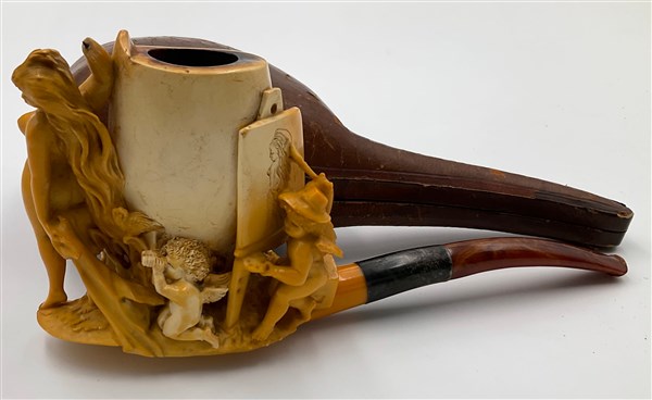 Pipa in schiuma di mare scolpita con Allegoria delle arti, bocchino con ghiera in metallo argentato, secolo XIX. In custodia (L. cm 22) (difetti e mancanze)