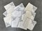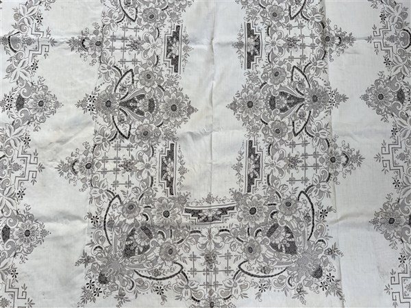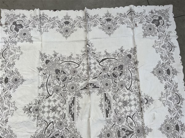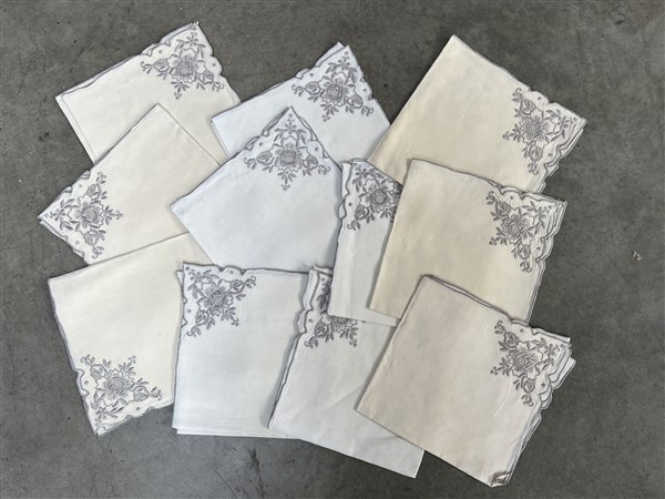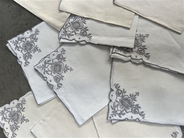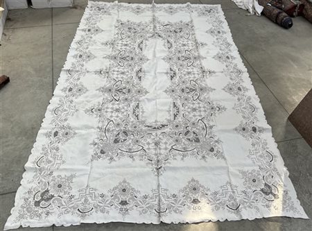Tovaglia in tessuto ricamato e sfilato nei toni del grigio perla (cm 254x159) unita ad undici tovaglioli (lievi difetti)