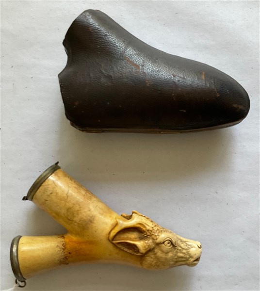 Carl Hiess, Vienna, 1871-1890. Braciere per pipa in schiuma di mare intagliata a forma di volto di stambecco, ghiere in metallo argentato (cm 13x10) In custodia (difetti)