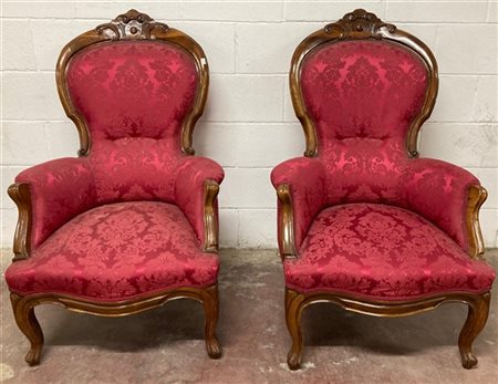 Coppia di poltrone in noce con schienali intagliati a motivi stilizzati, braccioli mossi. Secolo XIX (difetti)