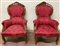 Coppia di poltrone in noce con schienali intagliati a motivi stilizzati, bracci