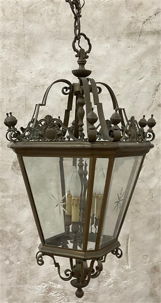 Lanterna da portico in bronzo a quattro luci, base quadrata con angoli smussati ed elementi decorativi a volute, vetri bisellati centrati da una stella, secolo XIX (h cm 98) (difetti)