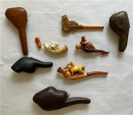 Lotto composto da quattro pipe in schiuma di mare intagliate con soggetti vari tra cui cavalli, volatili, figura femminile e amorini, bocchini in materiali differenti, secolo XIX. In custodie (difetti e mancanze)