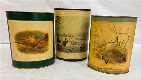Lotto composto da tre cestini di diverso materiale decorati con scene di caccia