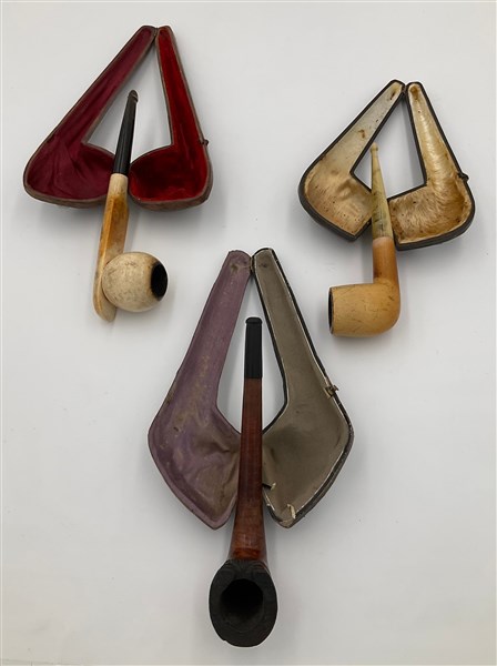 Lotto composto da tre pipe in materiali differenti tra cui una in radica con braciere a ferro di cavallo, in custodia (difetti)