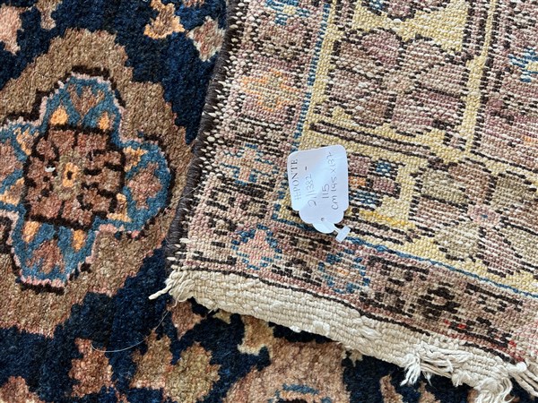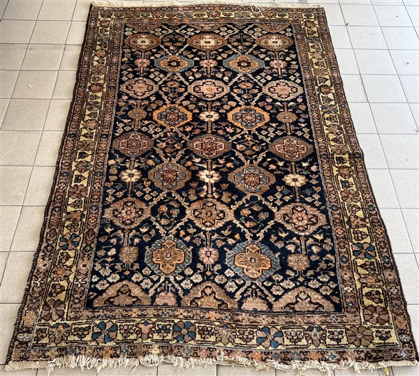 Tappeto Hamadan, Persia, inizio secolo XX. Decoro all over di piccoli medaglioni su fondo blu notte (cm 195x137) (difetti, sfrangiature)