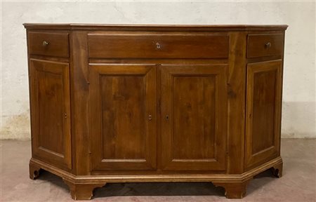 Antica credenza scantonata in noce con quattro sportelli e tre cassetti, piedi a mensola (cm 184x114x55) (difetti)