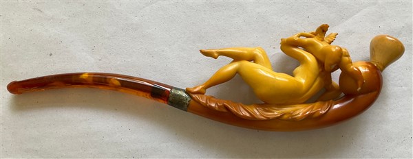 Emanuel Czapek, Praga, secolo XIX. Pipa in schiuma di mare intagliata con Venere e Amorino, ghiera in argento e bocchino in ambra. Secolo XIX. In custodia (L. cm 23) (difetti)