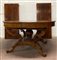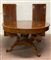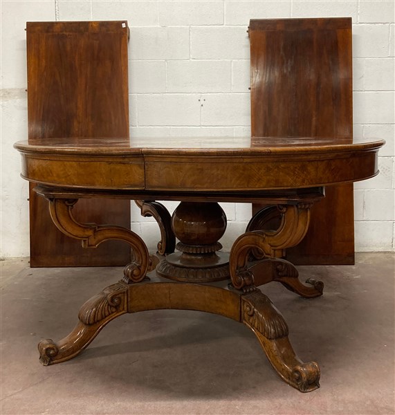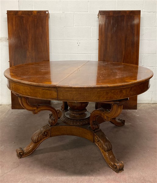 Tavolo allungabile di forma tonda lastronato in noce poggiante su gamba centrale tornita con montanti intagliati a volute, piedi a mensola. Secolo XIX (d. cm 150, h. cm 80) munito di due prolunghe (difetti)