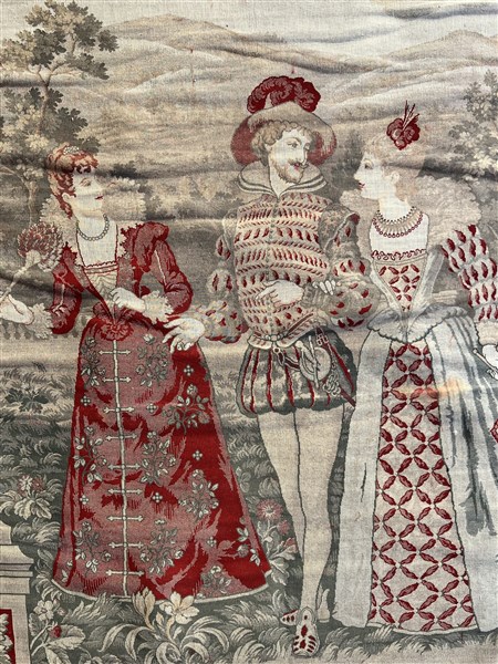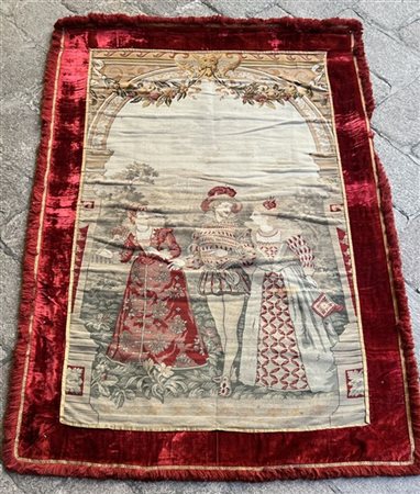 Arazzo meccanico, Inghilterra, secolo XIX epoca Vittoriana. Decorato con scena galante di gentiluomo con due dame in un paesaggio campestre. Incorniciato in un'architettura di stile neogotico con mascherone e ghirlande di frutta al centro. Bordura in velluto di seta color porpora. Passamaneria con spazzolino in metallo dorato e frange di seta rossa (cm 246x155) (lievi difetti, una piccola macchia)