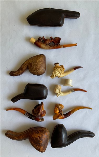 Lotto composto da cinque pipe in schiuma di mare intagliata e materiali differe