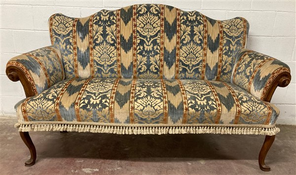 Divano ad orecchioni in noce con schienale sagomato, braccioli terminanti a ricciolo, piedi mossi, rivestito in tessuto operato. Secolo XVIII (L. cm 190) (difetti)