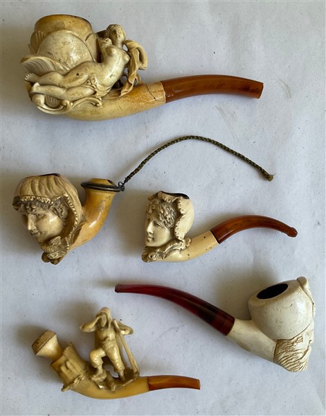 Lotto composto da cinque pipe in schiuma di mare intagliata e materiali differe